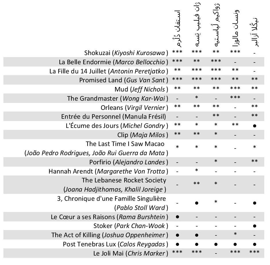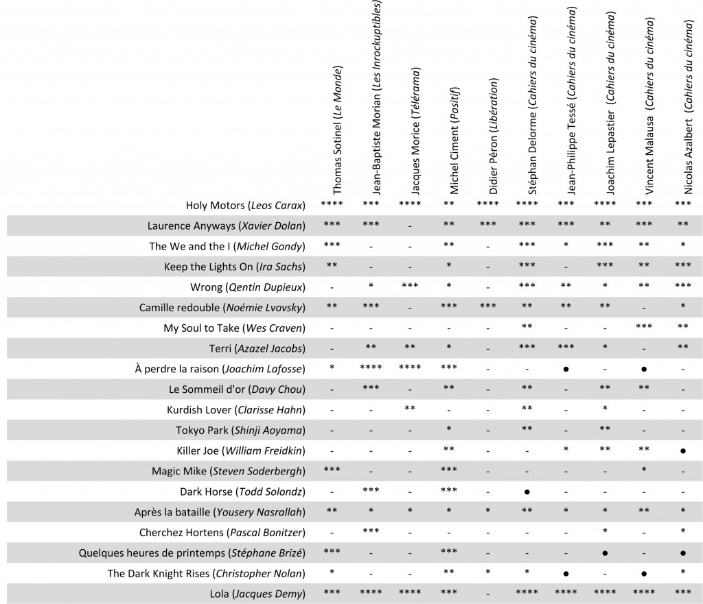 اگر اولین کنجکاویِ سینمایی این باشد که ببینی این روزها چه فیلمهایی دارد دیده میشود، احتمالا دومین کنجکاوی – حتا پیش از دیدن آن فیلمها – این است که ببینی بقیه چطور آنها را ارزشگذاری کردهاند. آخرین صفحهی کایه دو سینما با جدول ستارههایش، یکی از محلهای ارضای این دو کنجکاویست. معمولا پنج منتقد از کایه و پنج نفر از نشریات فرانسویِ دیگر ( لوموند، اَنرُکوپتیبل، پوزیتیف، لیبراسیون و تلهراما) در این بازیِ ماهانه شرکت دارند. جدول سپتامبر را اینجا بازنویسی کردهام.